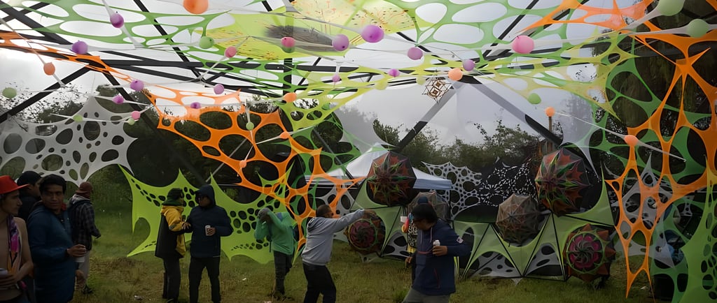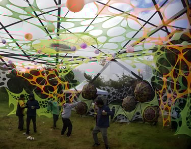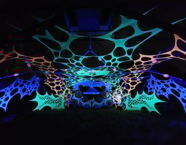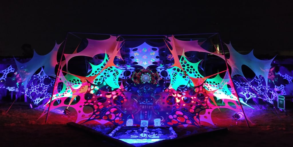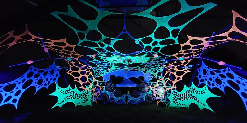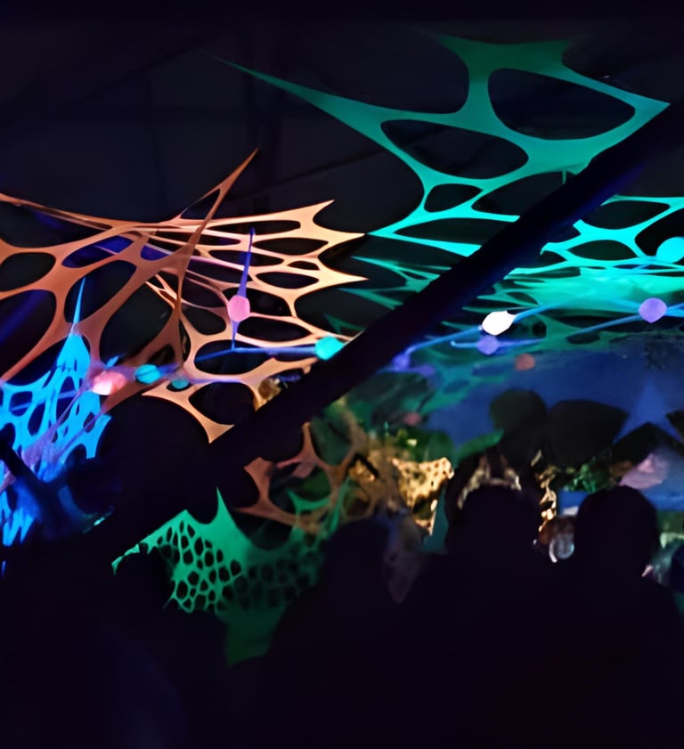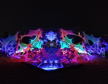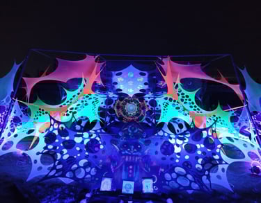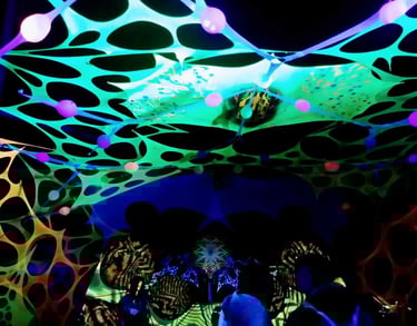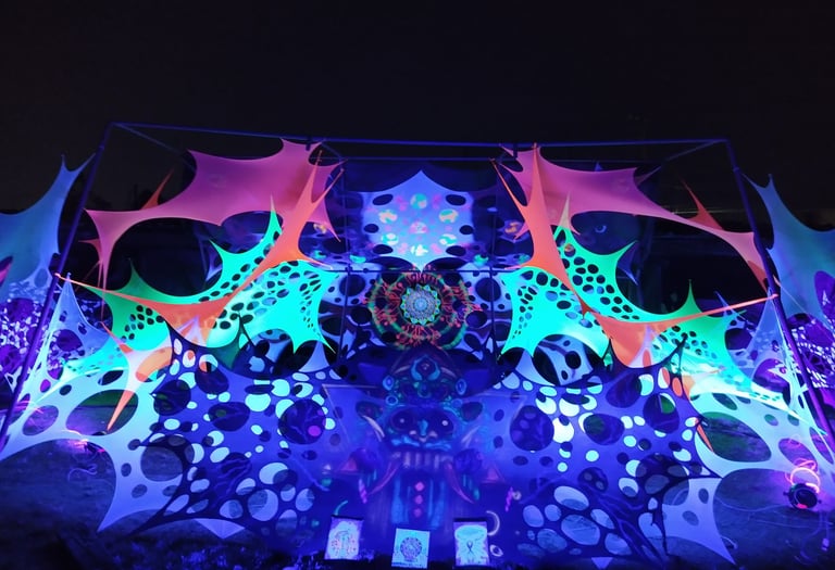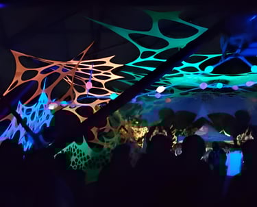 Decoración de eventos de música psicodélica underground basándonos en geometría, hilografía, telas, los cuales al fusionarse creamos ambientes bastante retorcidos y lleno de EUFORIA...